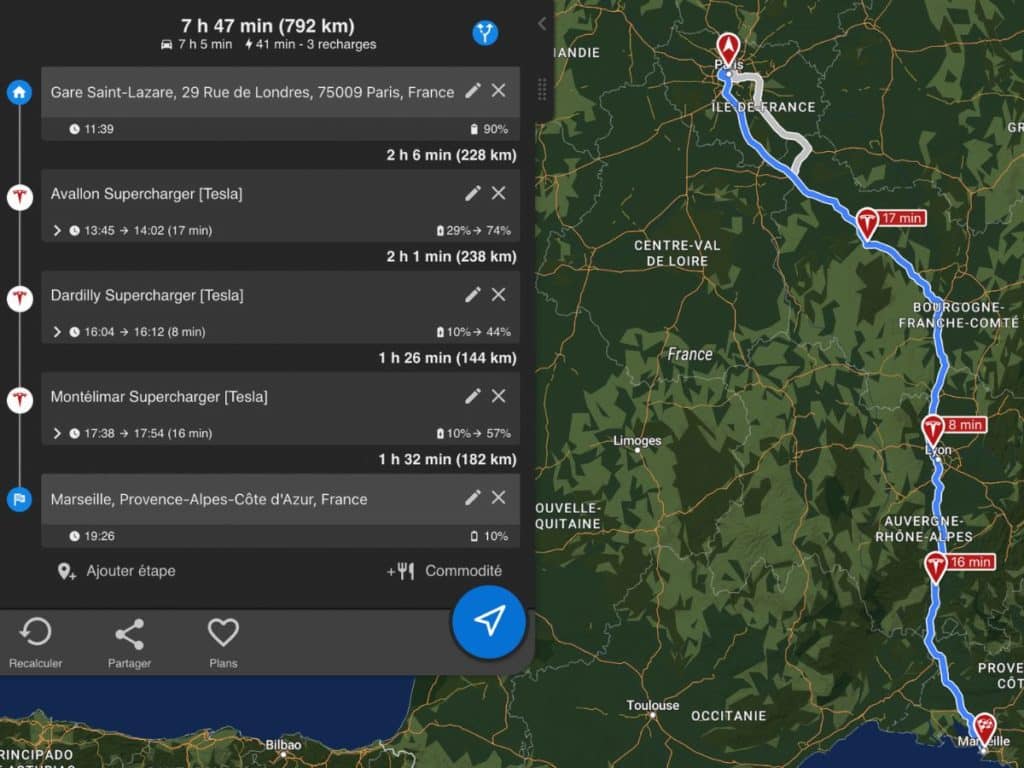 On vous a simulé l’itinéraire avec une Tesla Model 3 de 2022, long range.