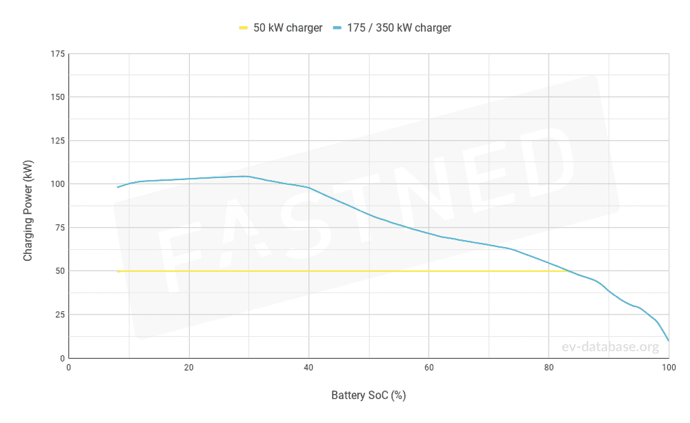 La vitesse de charge peut atteindre 100 kW sur les bornes de recharge rapides 175 et 350 kW, et 50 kW sur les autres chargeurs. Dans la courbe de charge ci-dessous, vous pouvez voir la vitesse de charge de l’i-Pace pour les deux chargeurs. En moyenne, l’i-Pace charge 100 km en 15 à 30 minutes. Avec un chargeur de 175 kW, la vitesse de charge diminue lentement à partir de 40 %. Avec un chargeur de 50 kW, elle atteint 80 %.