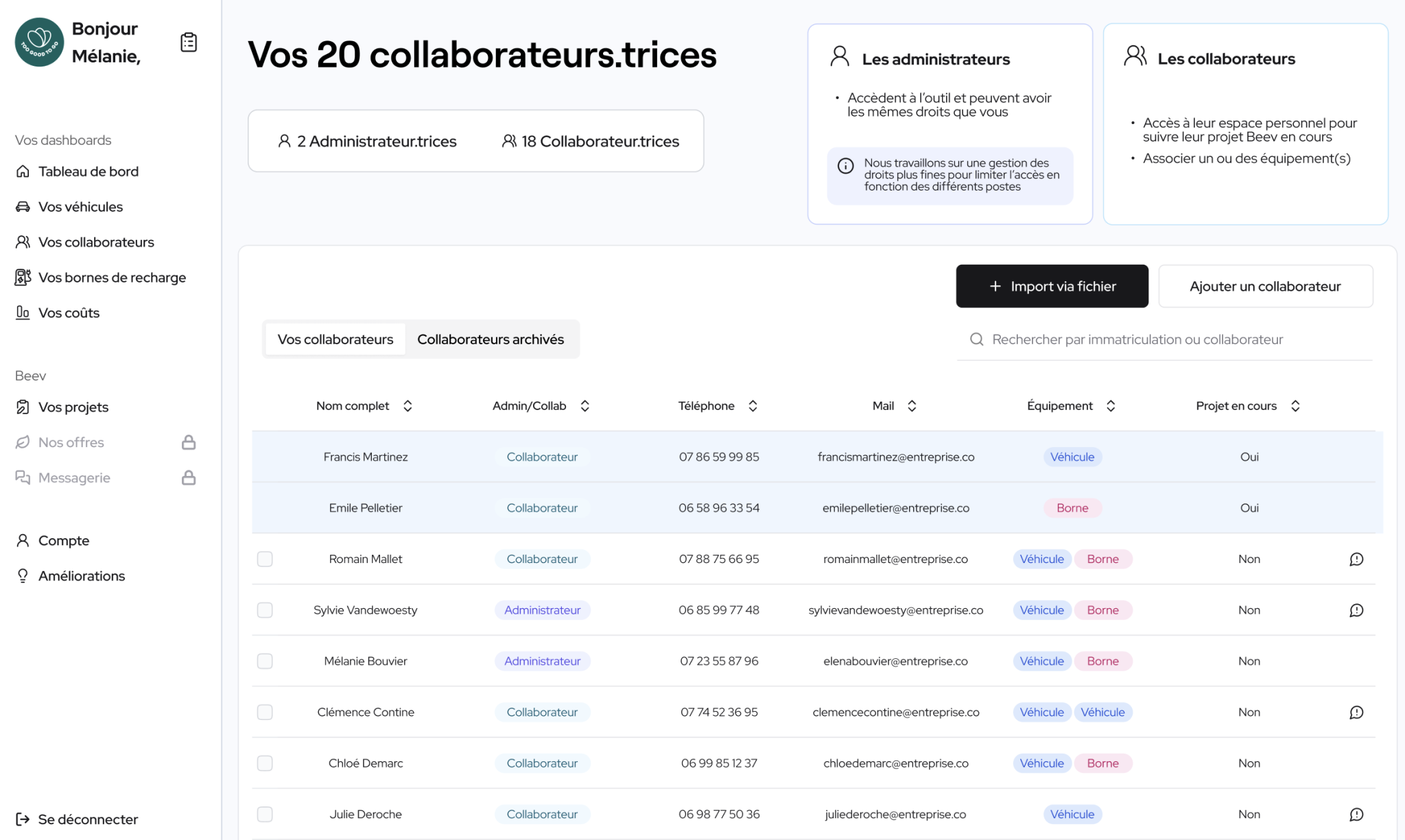 Oui. Beev Fleet Manager inclut un module de supervision des bornes de recharge, qu’elles soient en entreprise ou chez les collaborateurs. Vous pouvez suivre leur état, leur attribution, leur coût et plus encore depuis l’interface.